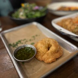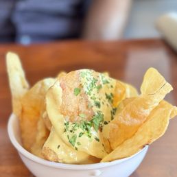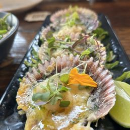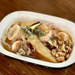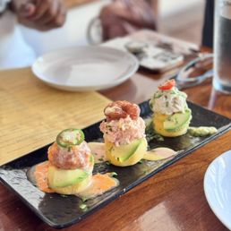 Hadn't had Peruvian food in a minute, so I was more than happy welcoming it back into my life with Aji. I was able to find a parking spot a block away, but I imagine it can get pretty tough on the weekends when things are a bit busier. From the jump, the ambience is nice, with an open-air view, modern interior, and solid selection of music. Our server, Rosita, was hilarious, hospitable, and helpful, sharing stories, assisting us with menu options, and cracking jokes all night. We'd ordered about half the menu. From what I recall, we had the golden beet salad, causa trio, chupe de camarones, and papa rellena de camarones, and picarones to finish things off for dessert. Everything was plated beautifully and had a very grand portion size fit for multiple people. For starters, we were served their house made potato chips, gargantuan in size and garnished with an aioli-like dressing. Crispy and delicious, loved it. Rosita explained potato chips originated in Peru, so I'd also learned something new. The golden beet salad was fresh, sweet, and had lots of flavor with its blend of numerous ingredients. Very pleasant to eat, especially loved the goat cheese and honey balsamic vinegar. The papa rellena de camarones felt like an entree with its miniature football-sized stature. It meshed excellently with the chipotle aioli and salsa criolla drizzle. Inside was flavorful, with an abundance of ingredients that worked nicely together; shrimp, onions, potato mash, paprika, green onions. Loved the causa trio, which helped when we were indecisive on which causa we wanted to order. It consisted of one of each of the following: limena, de camarones, and spicy tuna. I really enjoyed them all, but was seeing a trend playing personal favorites with the aioli, so I'll choose my victor here and go with the causa limena. It's a chilled potato mash topped off with crab, jalapeno aioli, and avacado. So much flavor. The picarones were one of the more unique desserts I'd ordered. They're essentially powdered crispy doughnuts filled with yam and cinnamon, with a large syrup base to immerse your fried friend in. Very sweet and satisfying. Great food, ambience, service, and overall experience. I'll come again to check out more options in the future.